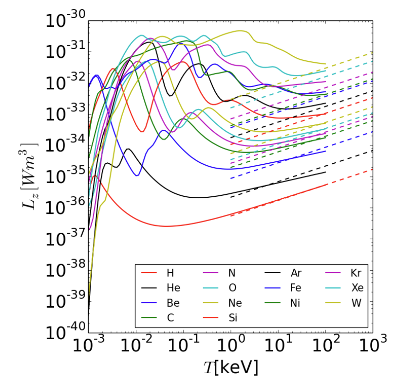 The computed loss functions exhibit a weak dependence on density but are evaluated at a fixed electron density of 10^{19} \text{m}^{-3}. This differs from strict coronal equilibrium, which assumes density independence. In practice, non-local effects arising from density and temperature gradients are significant but are not considered here. The loss functions account for Bremsstrahlung, line radiation, and recombination radiation, represented by: